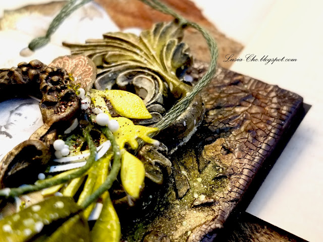 Мне хотелось максимально приблизится к палитре и теме ДВ. Слава Богу, что у меня еще есть в запасе алкоголики и кракелюрная паста от СкрапЭго!)) Все элементы декора подкрашены в тон палитре с помощью спреев и лака -акцента Разбитое стекло. (мой любимчик)