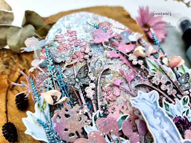 Настолько мне понравилась палитра нашей доски и картинки, что я решила с помощью высечек и вырезанных элементов из коллекции #mystery_paper создать небольшую лесную историю. Тут как никогда мне пригодился небольшой спил, который давно ждал своего часа. Главная героиня моего панно -это лисичка, которая в последние теплые осенние денечки засмотрелась на порхающих мотыльков!