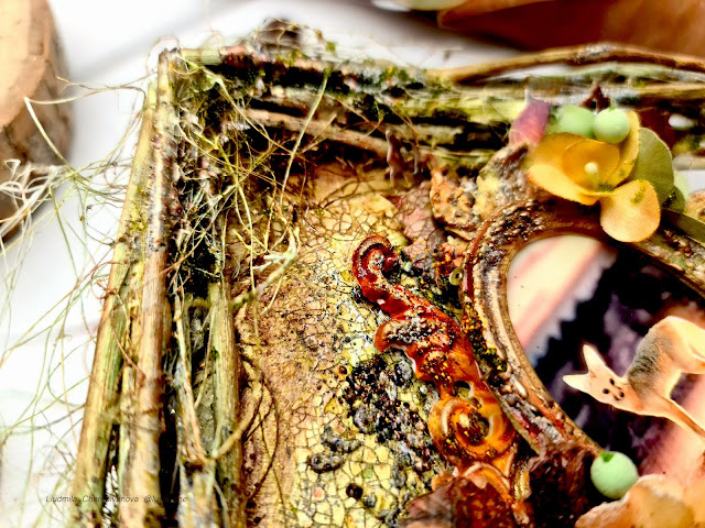 Для вырубки осенних листиков я использовала заранее заготовленный фон - скрапбумага, покрытая спреями и кракелюрной пастой. Фоновую вырубку я покрыла пудрой для эмбоссинга. Также для составления композиции я использовала лепнину и вырезанные бумажные элементы! Деревянную основу усложняла спреями, текстурной пастой и пудрой для эмбоссинга!
